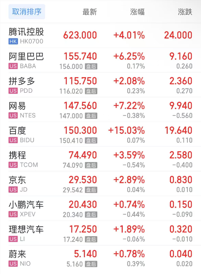 上周五,热门中概股方面,腾讯控股(港股)涨4.01%,阿里巴巴涨6.25%,拼多多涨2.08%,网易涨7.22%,百度涨15.03%,携程涨3.59%,小鹏汽车涨0.74%,理想汽车涨1.89%,蔚来涨0.78%。