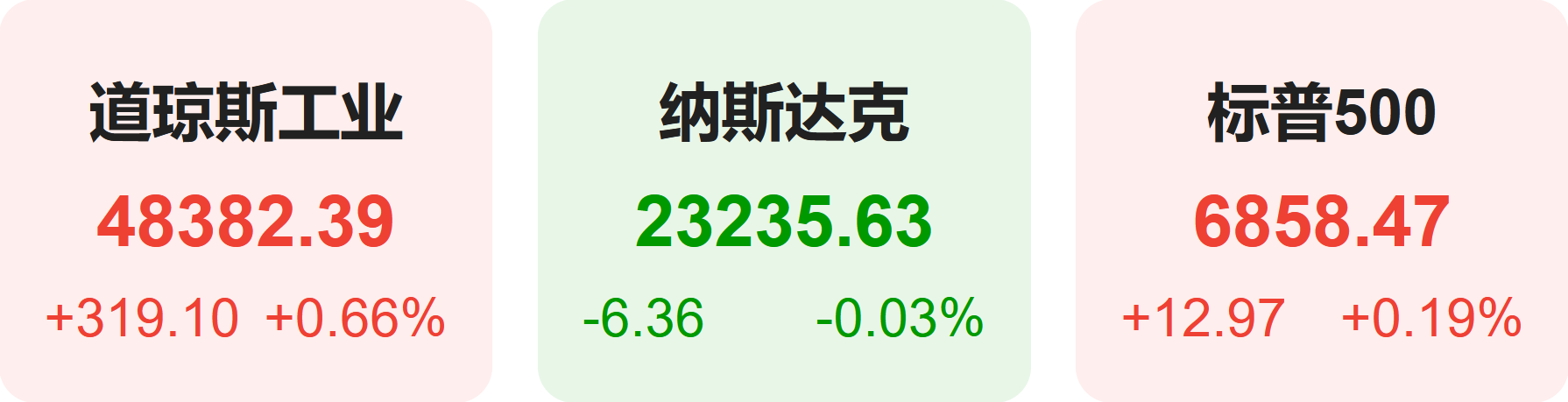 截至上周五收盘,标普500指数涨0.19%,报6858.47点;道琼斯指数涨0.66%,报48382.39点;纳斯达克指数跌0.03%,报23235.63点。