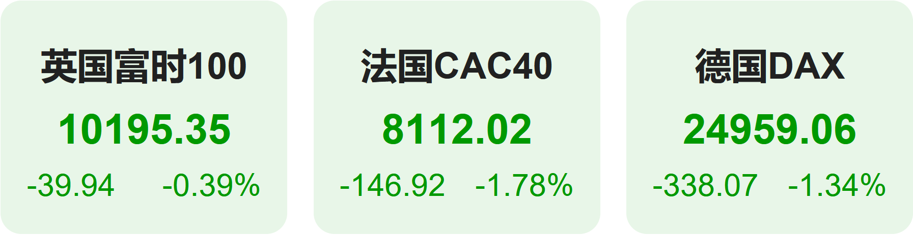 欧洲股市方面,英国富时100指数小幅下跌0.39%,报10195点。法国CAC40指数下跌1.78%,报8112点。德国DAX指数下跌1.34%,报24959点。