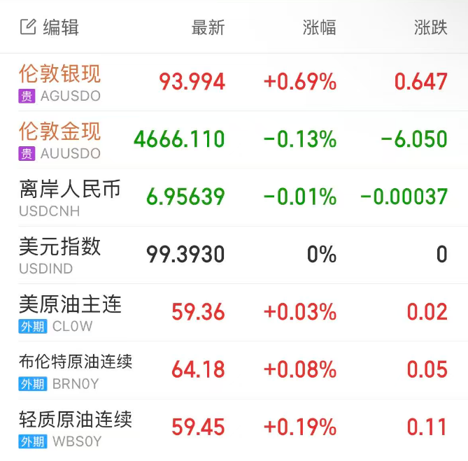 受助于避险需求,现货金银周一双双创下纪录新高,现货黄金一度触及4680美元,伦敦金最终收跌0.05%,报4669.93美元/盎司;伦敦银最终收涨1.01%,报94.285美元/盎司。