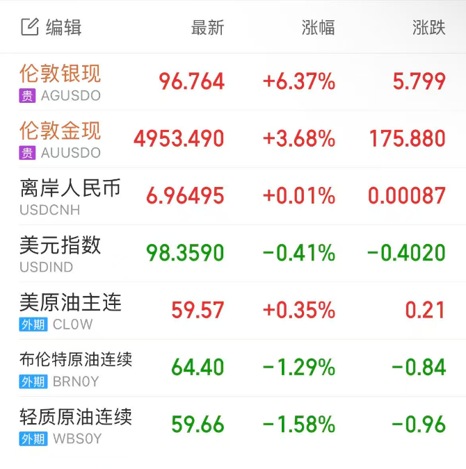 现货黄金涨势不止,最高站上4950美元,伦敦金最终收涨3.31%,报4935美元/盎司,本月涨幅已达13%,累涨近600美元;现货白银站上96美元/盎司,伦敦银最终收涨5.71%,报96.16美元/盎司。