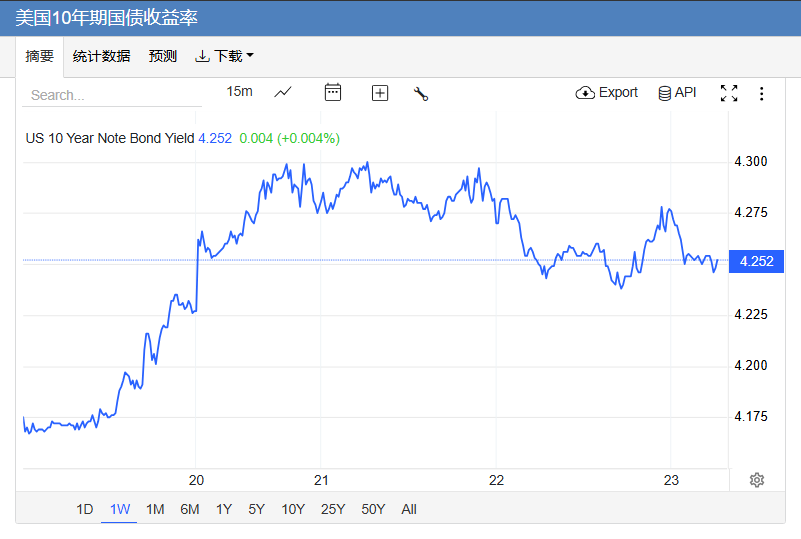 美债收益率企稳,基准的10年期美债收益率最终收报4.252%,对美联储政策利率敏感的2年期美债收益率收报3.610%。