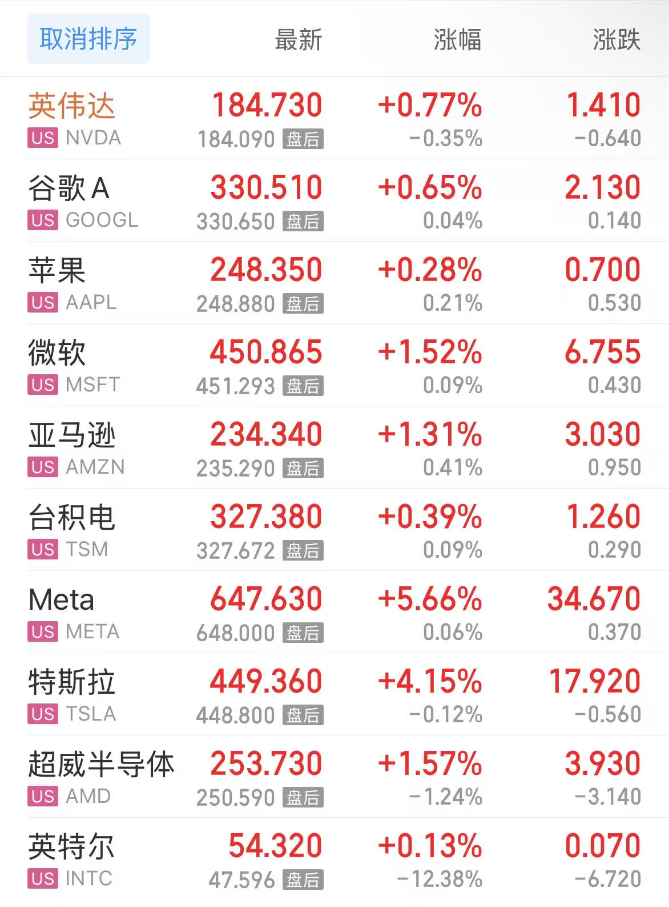 热门美股中,英伟达涨0.77%,谷歌C涨0.75%,谷歌A涨0.65%,苹果涨0.28%,微软涨1.52%,亚马逊涨1.31%,台积电涨0.39%,Meta涨5.66%,特斯拉涨4.15%,超威半导体涨1.57%,英特尔涨0.13%。