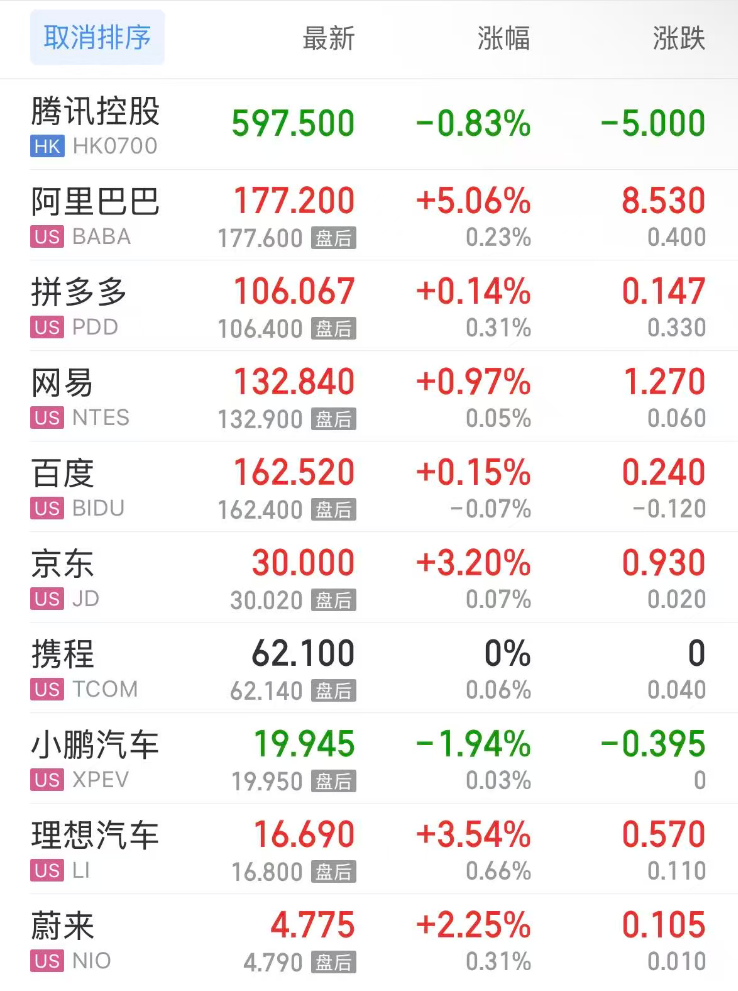 热门中概股方面,腾讯控股(港股)跌0.83%,阿里巴巴涨5.06%,拼多多涨0.14%,网易涨0.97%,百度涨0.15%,携程涨0.00%,小鹏汽车跌1.94%,理想汽车涨3.54%,蔚来涨2.25%。