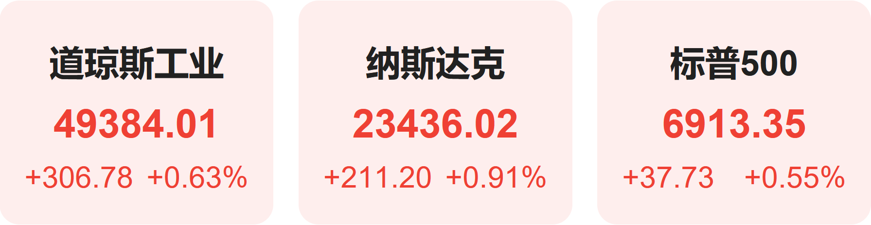 截至收盘,标普500指数涨0.55%,报6913.35点;道琼斯指数涨0.63%,报49384.01点;纳斯达克指数涨0.91%,报23436.02点。