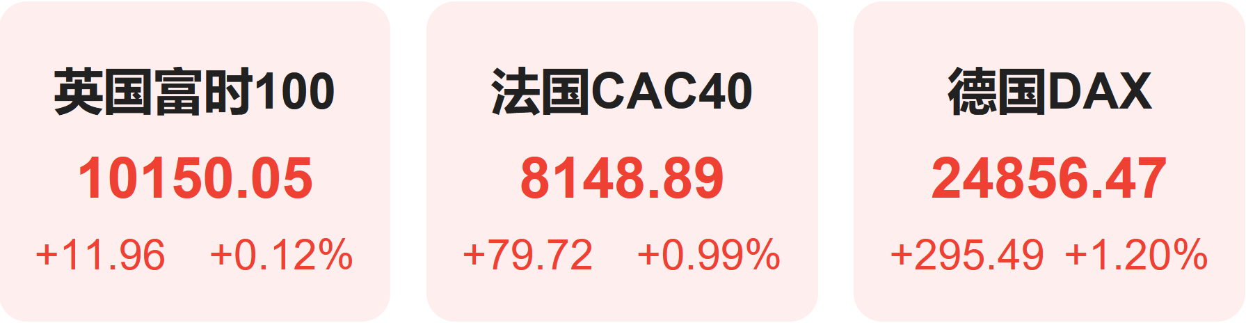 欧洲股市方面,英国富时100指数小幅上涨0.12%,报10150点。法国CAC40指数小幅上涨0.99%,报8149点。德国DAX指数上涨1.20%,报24856点。