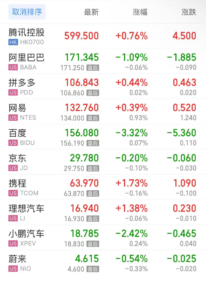 热门中概股方面,腾讯控股(港股)涨0.76%,阿里巴巴跌1.09%,拼多多涨0.44%,网易涨0.39%,百度跌3.32%,携程涨1.73%,理想汽车涨1.38%,小鹏汽车跌2.42%,蔚来跌0.54%。