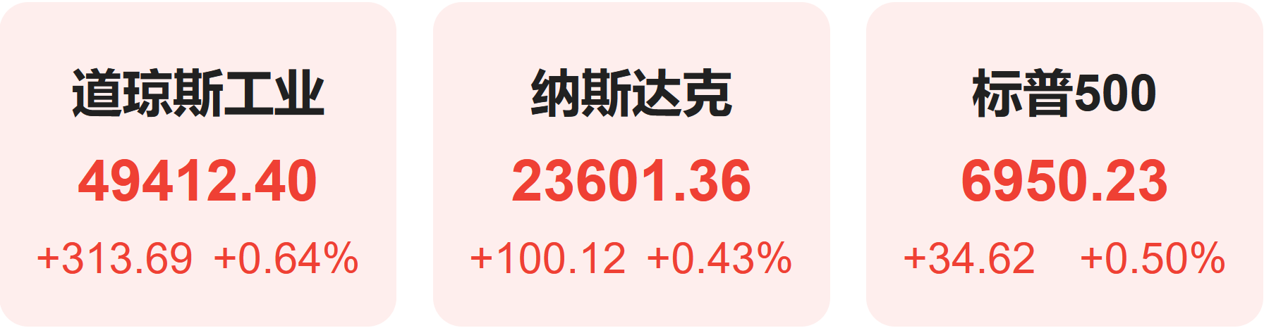 截至收盘,标普500指数涨0.50%,报6950.23点;道琼斯指数涨0.64%,报49412.40点;纳斯达克指数涨0.43%,报23601.36点。
