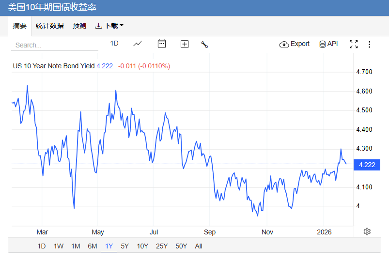 基准的10年期美债收益率走低,最终收报4.222%,对美联储政策利率敏感的2年期美债收益率收报3.598%。