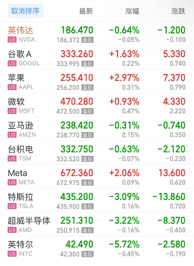 热门美股中,英伟达跌0.64%,谷歌C涨1.57%,谷歌A涨1.63%,苹果涨2.97%,微软涨0.93%,亚马逊跌0.31%,台积电跌0.63%,Meta涨2.07%,特斯拉跌3.09%,超威半导体跌3.22%,英特尔跌5.72%。